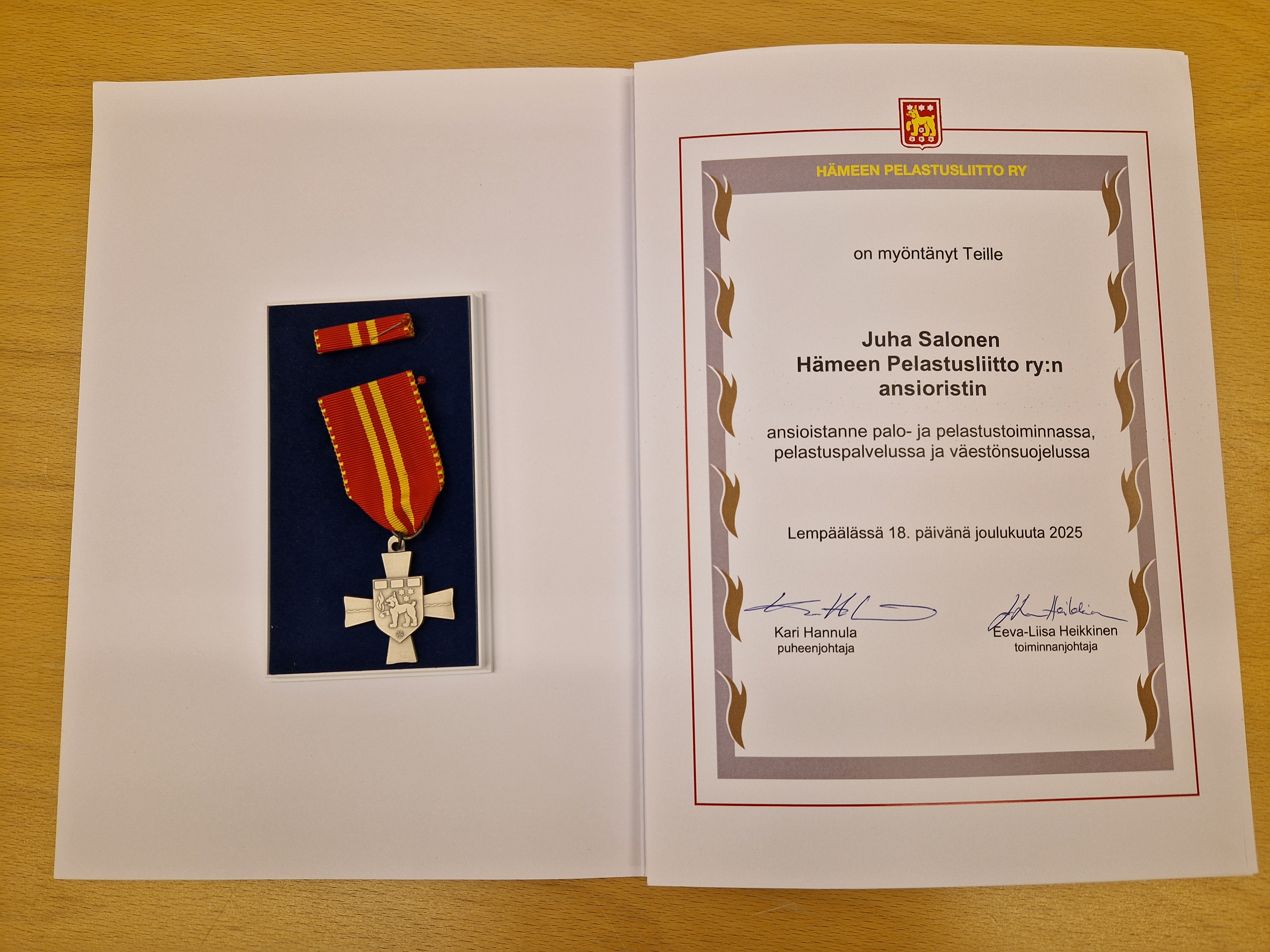 – Tänään meillä on erityinen hetki pysähtyä ja osoittaa arvostusta teolle, joka kuvastaa pelastustoimen ydintä kaikessa yksinkertaisuudessaan ja vaativuudessaan. Juha, syksyllä Padasjoella tapahtunut tilanne osoitti, miten vahvasti pelastustoimen arvot – ammatillisesti, inhimillisesti, luotettavasti – elävät konkreettisina tekoina meidän arjessamme, Päijät-Hämeen pelastuslaitoksen pelastusjohtaja Mira Leinonen aloitti puheensa palkitsemistilaisuudessa Paavolan pelastusasemalla.