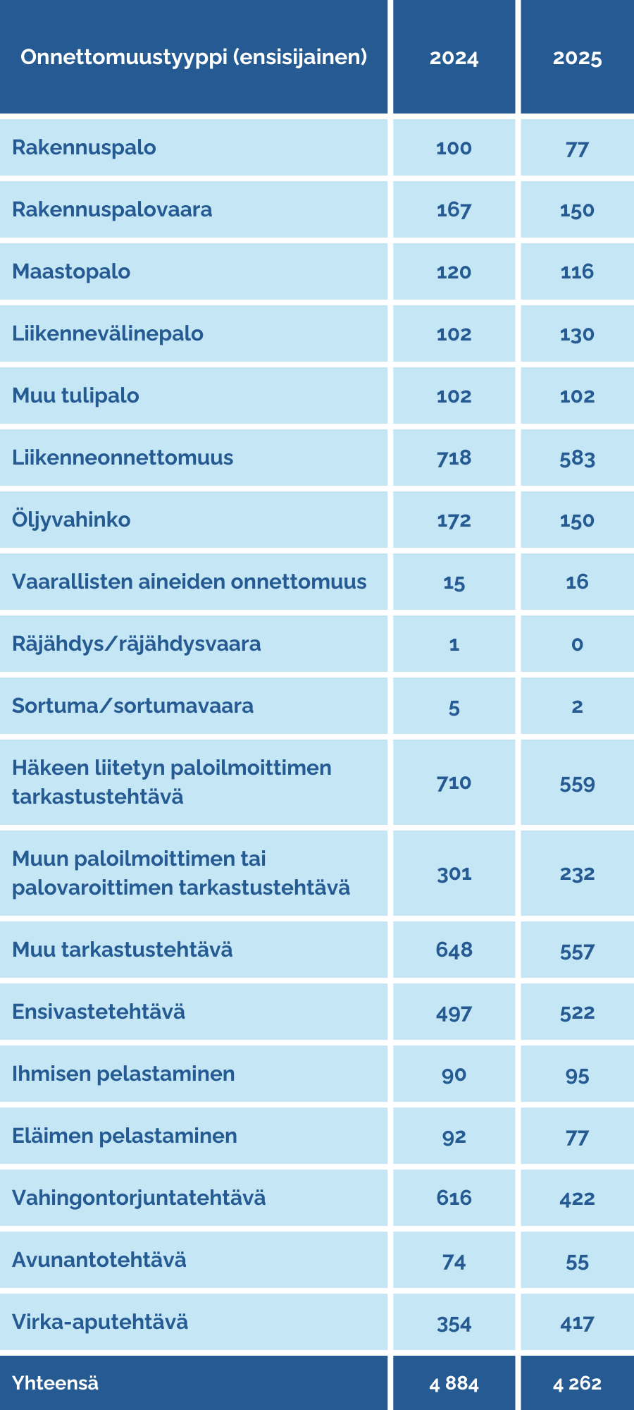 Vuonna 2025 eniten pelastustoimen tehtäviä Keski-Suomessa aiheuttivat liikenneonnettomuudet (583), hätäkeskukseen liitettyjen paloilmoittimen tarkastukset (559), muut tarkastukset (557) ja ensivastetehtävät (522).