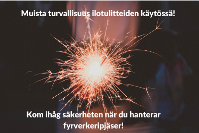 Ilotulitteiden myynti alkoi maanantaina 27.12. ja se päättyy uudenvuoden aattoiltana 31.12. Käytä vain hyväksyttyjä Suomessa myytäviä ilotulitteita, joissa on CE-merkintä. Hätäraketteja ei saa käyttää ilotulitteina.