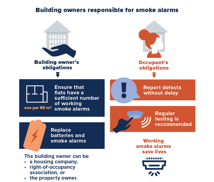The obligation to purchase and maintain smoke alarms lies with the building owner, while the resident is responsible for testing them and reporting any need for repairs. In accommodation and care facilities, the operator will remain responsible for the purchase and maintenance of smoke alarms . The changes that came into force at the beginning of 2026 primarily affect housing companies and rental property companies.