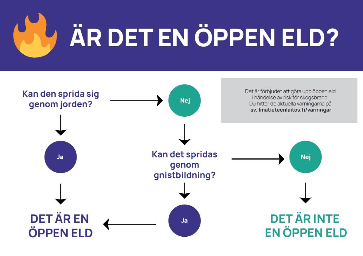 Med öppen eld avses all eld som kan komma lös och sprida sig i omgivningen genom marken eller gnistor. Användningen av lättkonstruerade grillar som placeras direkt på marken, som lätt kan välta i vinden, anses i räddningslagen vara en öppen eld. Dessa inkluderar engångsgrillar som inte får användas under varning för terrängbrand eller om brandrisken av annan anledning är uppenbar. En plötslig vindby kan vara överraskande kraftig och sprida lågorna långt från tändningsplatsen. Med hjälp av vinden kan en liten brand snabbt sprida sig till en stor och okontrollerbar brand. För att tända en öppen eld behövs alltid också markägarens tillstånd.